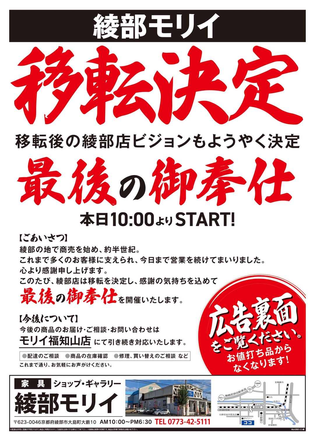 なお、今後の商品のお届けやご相談はモリイ福知山店にて引き続き対応いたします。