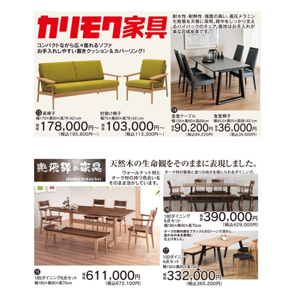 また、カリモク家具や天然木ダイニングなど、こだわりの家具も多数展示しています。品質の良い家具をお得に手に入れるチャンスです。