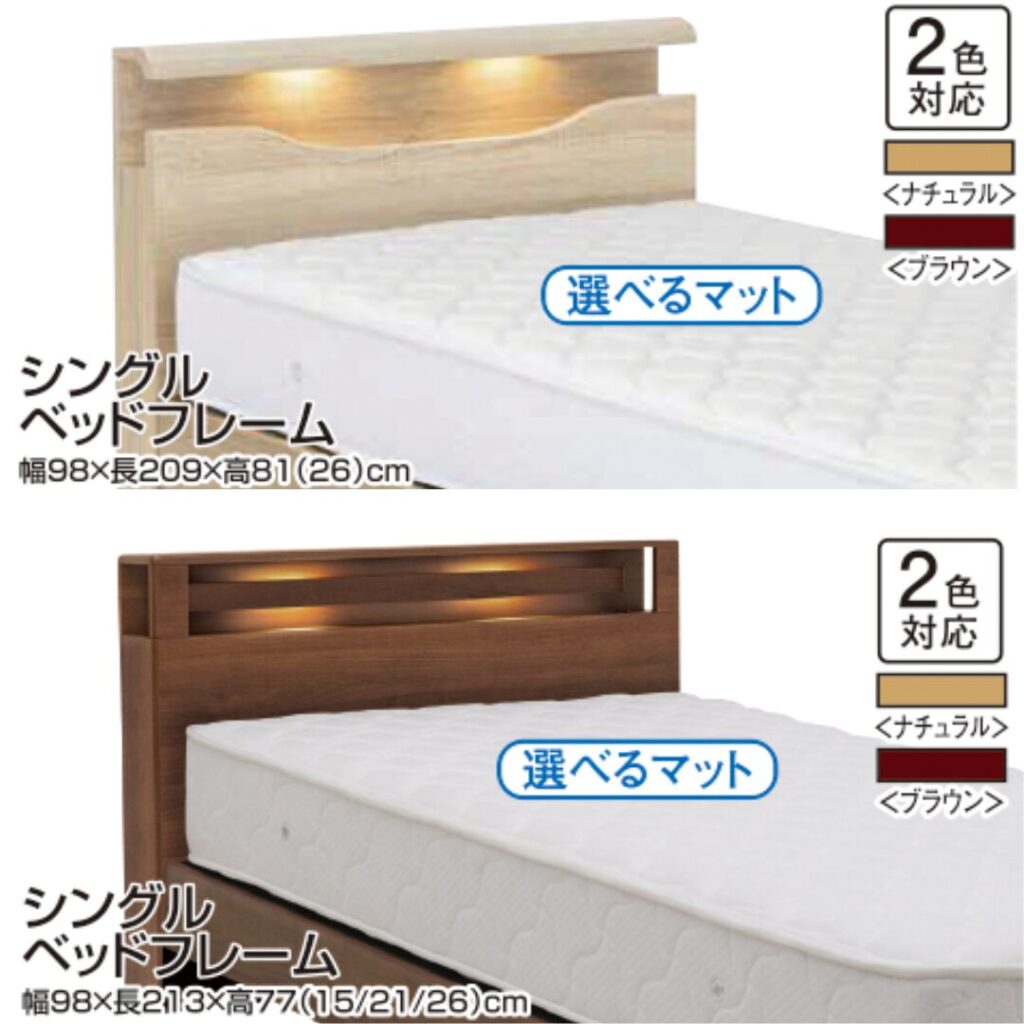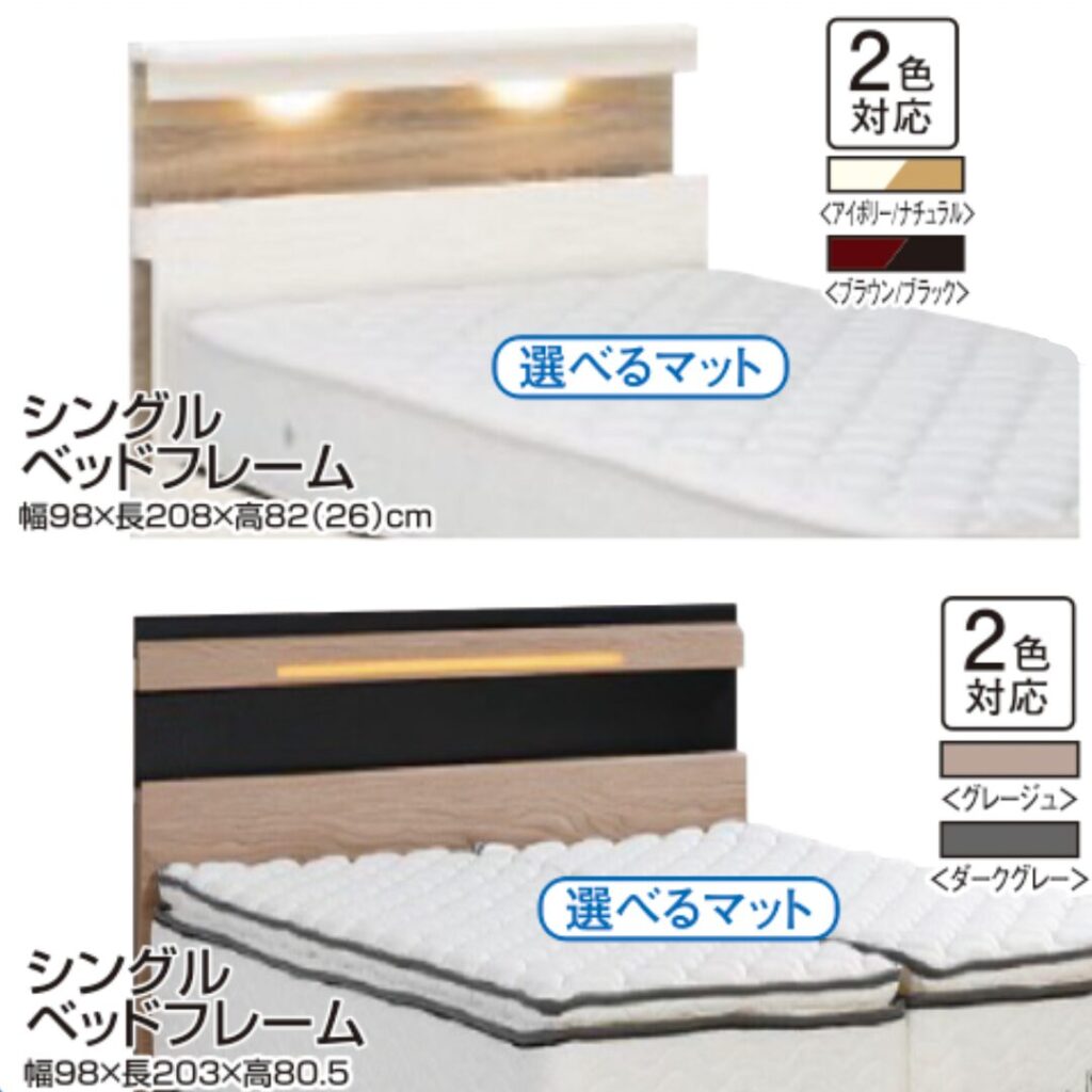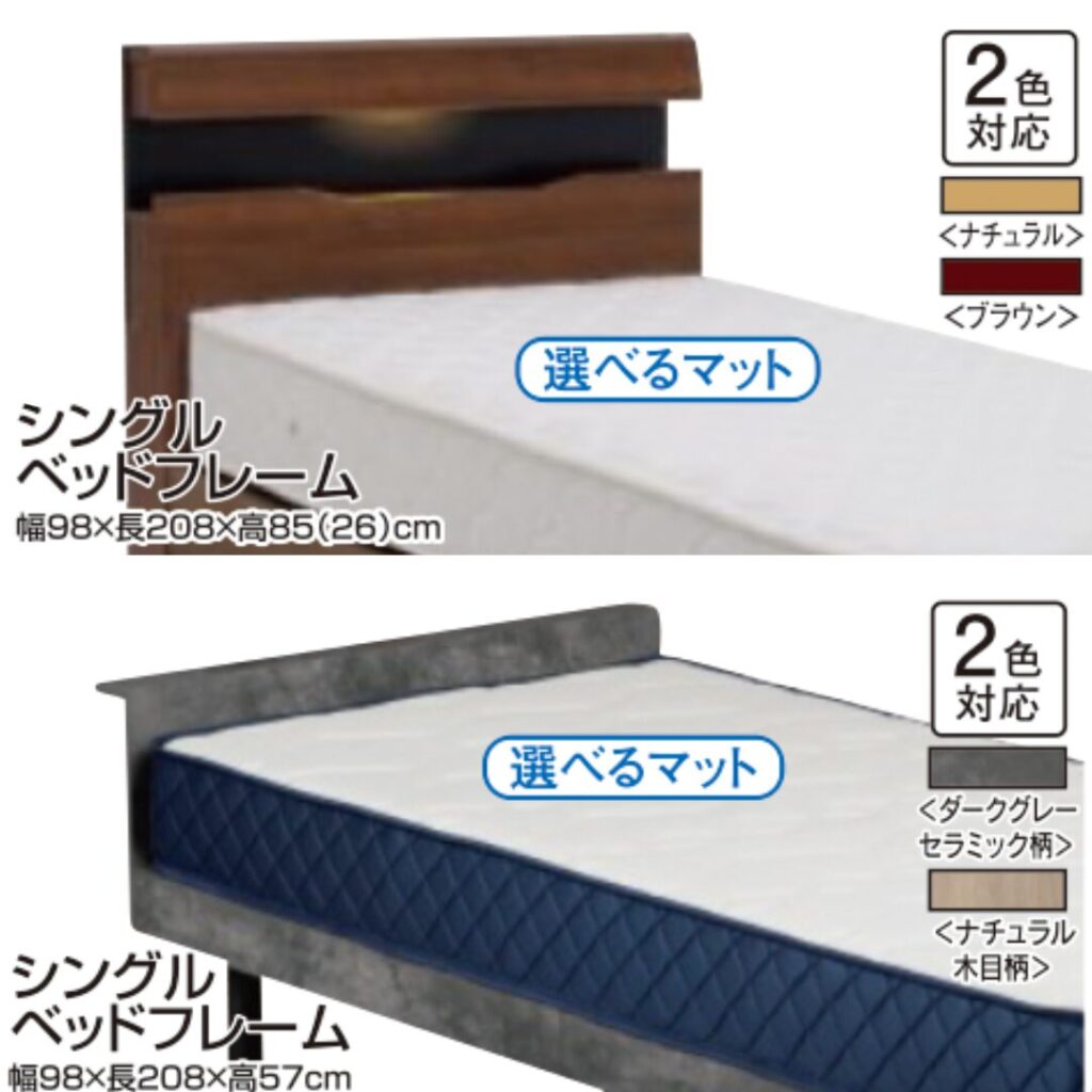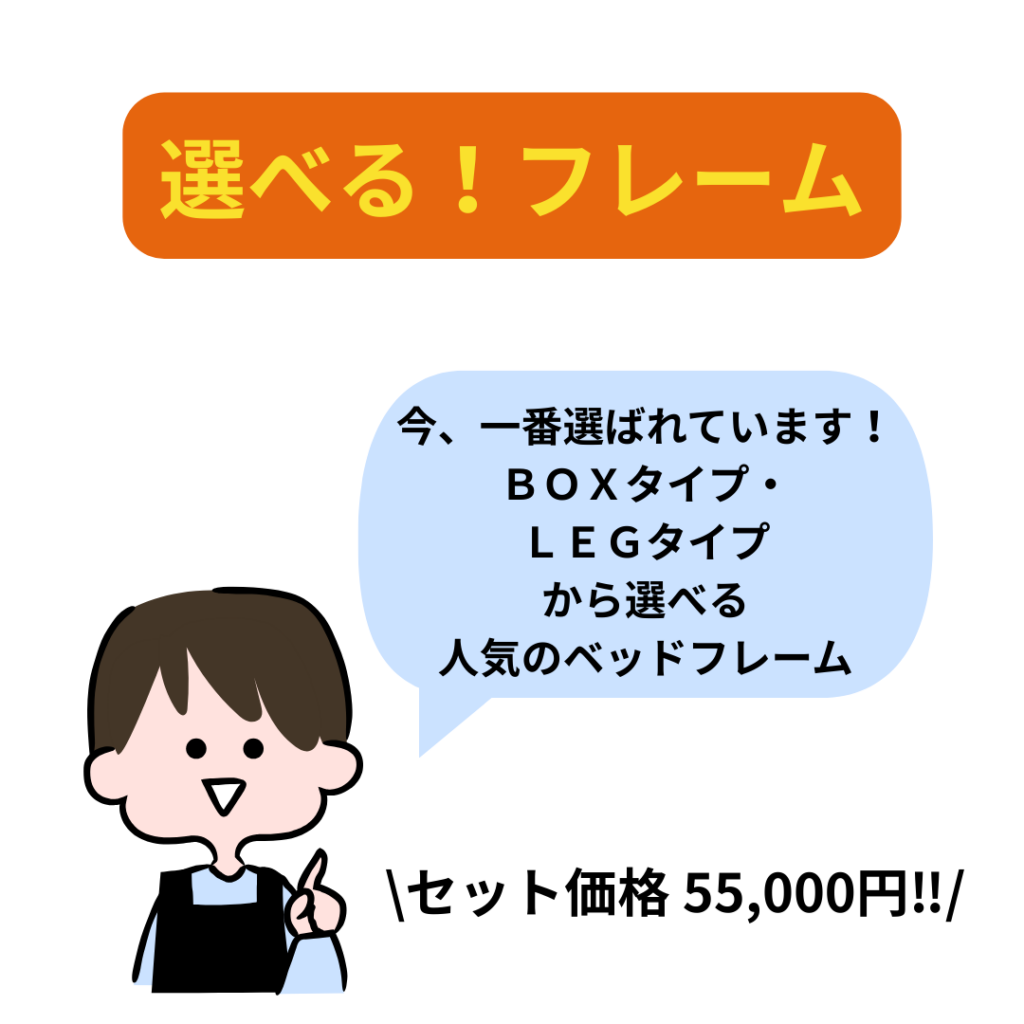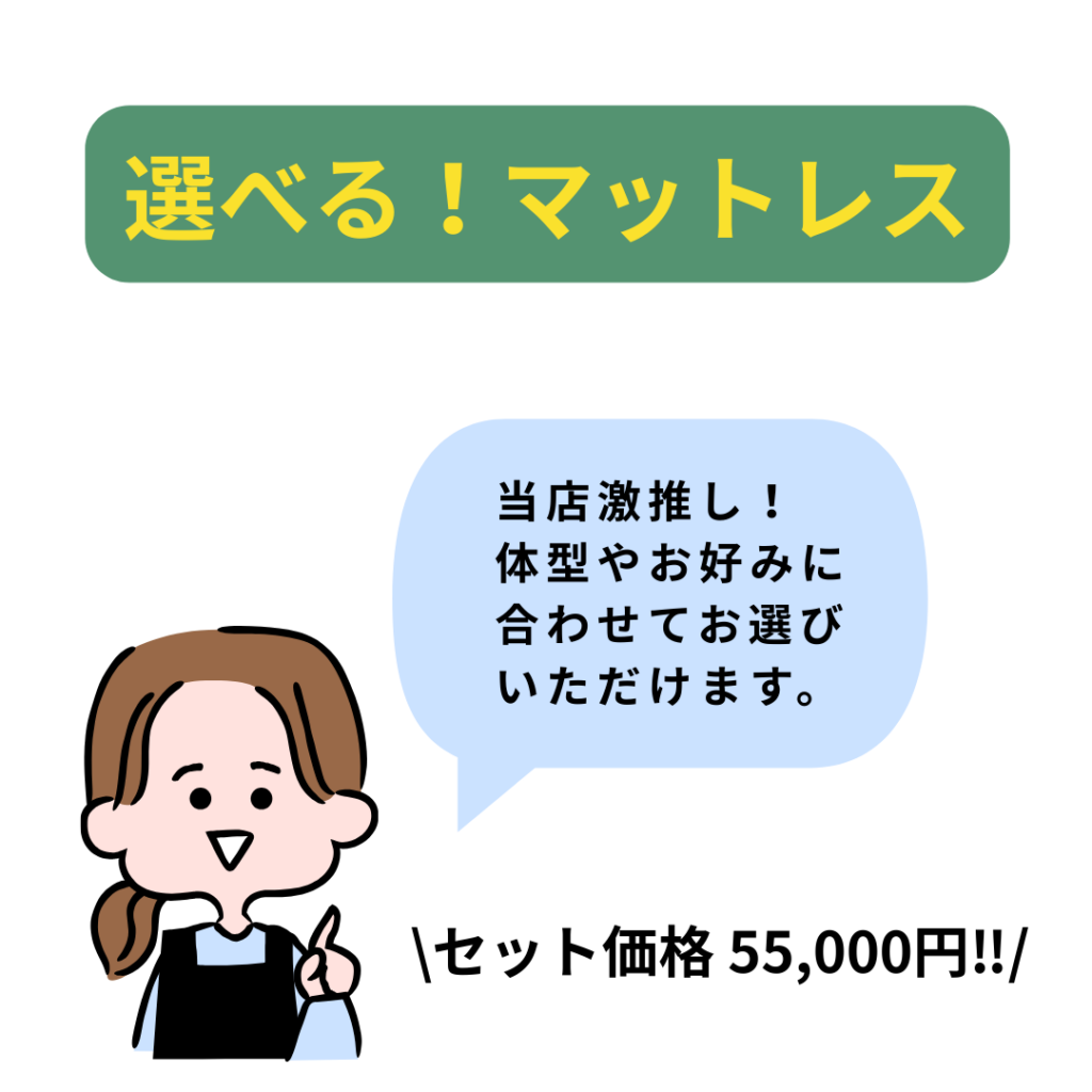 フレーム6種類×マットレス7種類から自由に選べて、どれでも税込55,000円というお得なセット価格をご用意しています。合計84通りの組み合わせから、お好みの寝心地をお選びいただけます🛏️