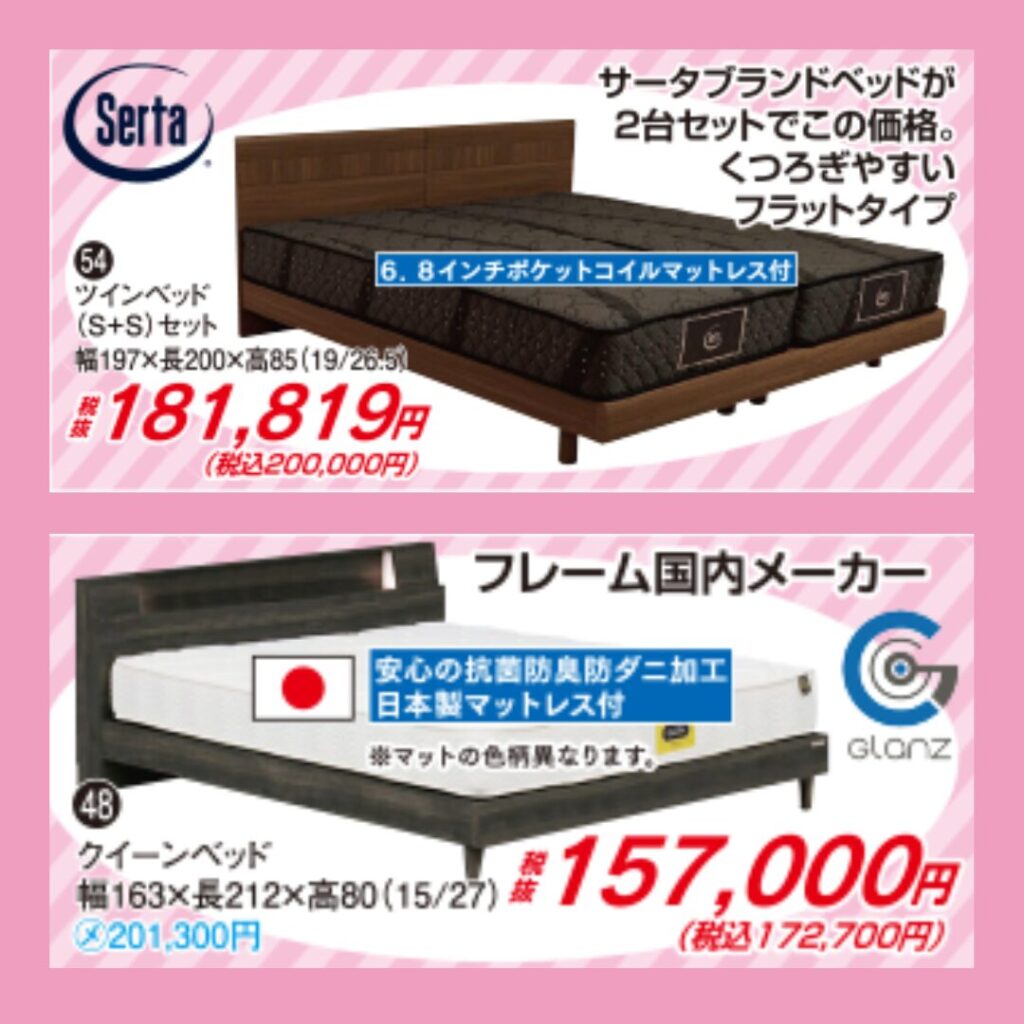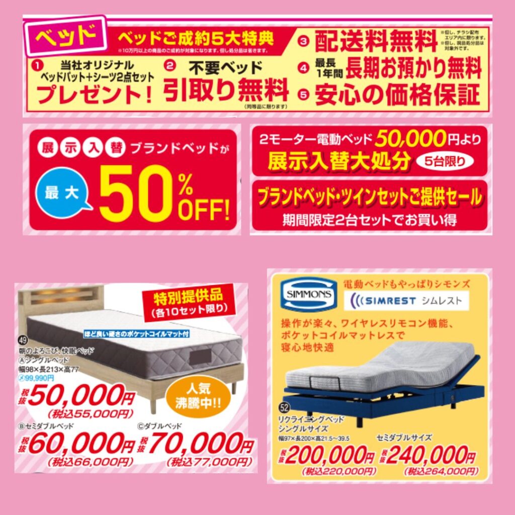 また、期間中はベッドご成約で配送無料や不要ベッドの引取など嬉しいサービスもご用意。